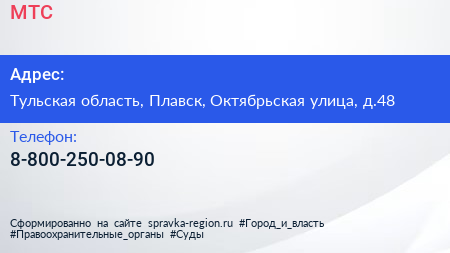 МТС по адресу Тульская область, Плавск, Октябрьская улица, д.48 в дальнейшем Организация, размещена в следующих категориях: