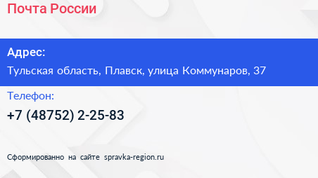 Почта России по адресу Тульская область, Плавск, улица Коммунаров, 37 в дальнейшем Организация, размещена в следующих категориях: