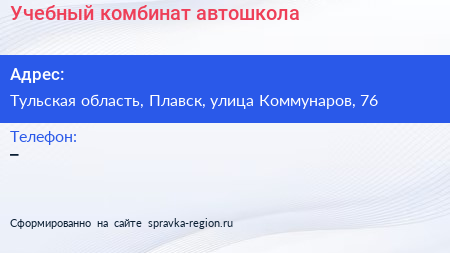 Учебный комбинат, автошкола по адресу Тульская область, Плавск, улица Коммунаров, 76 в дальнейшем Организация, размещена в следующих категориях: