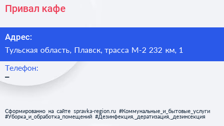 Привал, кафе по адресу Тульская область, Плавск, трасса М-2 232 км, 1 в дальнейшем Организация, размещена в следующих категориях: