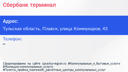 Сбербанк, терминал по адресу Тульская область, Плавск, улица Коммунаров, 43 в дальнейшем Организация, размещена в следующих категориях: