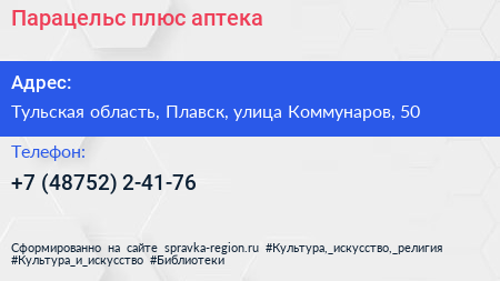 Парацельс плюс, аптека по адресу Тульская область, Плавск, улица Коммунаров, 50 в дальнейшем Организация, размещена в следующих категориях: