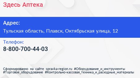 Здесь Аптека по адресу Тульская область, Плавск, Октябрьская улица, 12 в дальнейшем Организация, размещена в следующих категориях: