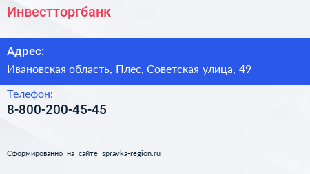 Инвестторгбанк по адресу Ивановская область, Плес, Советская улица, 49 в дальнейшем Организация, размещена в следующих категориях: