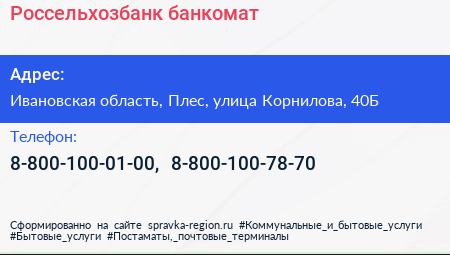 Россельхозбанк, банкомат по адресу Ивановская область, Плес, улица Корнилова, 40Б в дальнейшем Организация, размещена в следующих категориях: