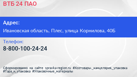 ВТБ 24, ПАО по адресу Ивановская область, Плес, улица Корнилова, 40Б в дальнейшем Организация, размещена в следующих категориях: