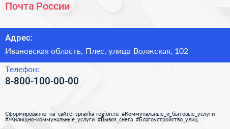Почта России по адресу Ивановская область, Плес, улица Волжская, 102 в дальнейшем Организация, размещена в следующих категориях: