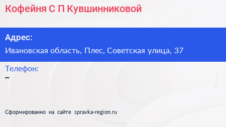 Кофейня С.П. Кувшинниковой по адресу Ивановская область, Плес, Советская улица, 37 в дальнейшем Организация, размещена в следующих категориях: