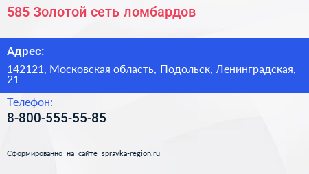 585*Золотой, сеть ломбардов по адресу 142121, Московская область, Подольск, Ленинградская, 21 в дальнейшем Организация, размещена в следующих категориях: