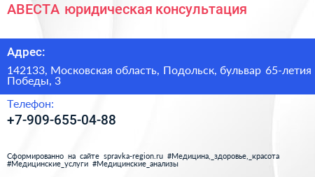 АВЕСТА, юридическая консультация по адресу 142133, Московская область, Подольск, бульвар 65-летия Победы, 3 в дальнейшем Организация, размещена в следующих категориях: