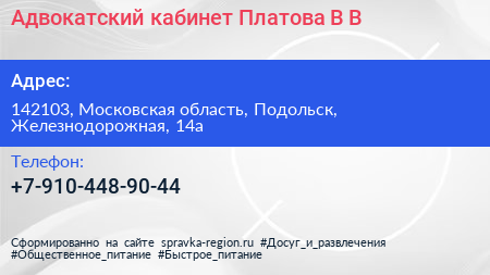 Адвокатский кабинет Платова В.В. по адресу 142103, Московская область, Подольск, Железнодорожная, 14а в дальнейшем Организация, размещена в следующих категориях: