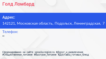 Голд Ломбард по адресу 142121, Московская область, Подольск, Ленинградская, 7 в дальнейшем Организация, размещена в следующих категориях: