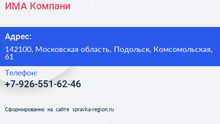 ИМА Компани по адресу 142100, Московская область, Подольск, Комсомольская, 61 в дальнейшем Организация, размещена в следующих категориях: