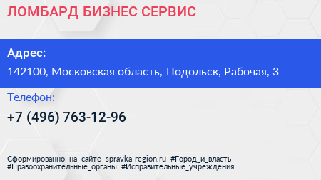ЛОМБАРД БИЗНЕС СЕРВИС по адресу 142100, Московская область, Подольск, Рабочая, 3 в дальнейшем Организация, размещена в следующих категориях: