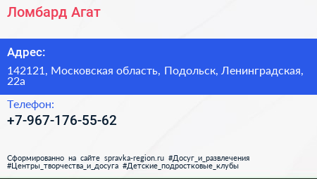 Ломбард Агат+ по адресу 142121, Московская область, Подольск, Ленинградская, 22а в дальнейшем Организация, размещена в следующих категориях: