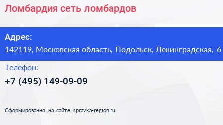 Ломбардия, сеть ломбардов по адресу 142119, Московская область, Подольск, Ленинградская, 6 в дальнейшем Организация, размещена в следующих категориях: