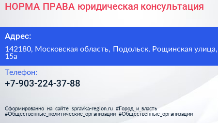 НОРМА ПРАВА, юридическая консультация по адресу 142180, Московская область, Подольск, Рощинская улица, 15а в дальнейшем Организация, размещена в следующих категориях: