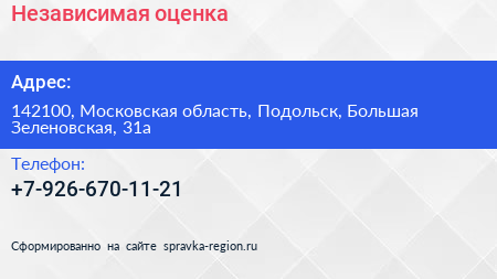 Независимая оценка по адресу 142100, Московская область, Подольск, Большая Зеленовская, 31а в дальнейшем Организация, размещена в следующих категориях:
