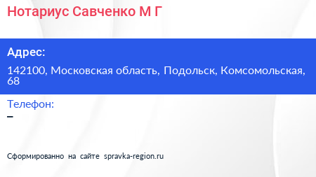 Нотариус Савченко М.Г. по адресу 142100, Московская область, Подольск, Комсомольская, 68 в дальнейшем Организация, размещена в следующих категориях:
