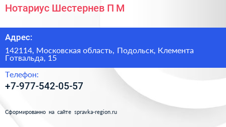 Нотариус Шестернев П.М. по адресу 142114, Московская область, Подольск, Клемента Готвальда, 15 в дальнейшем Организация, размещена в следующих категориях: