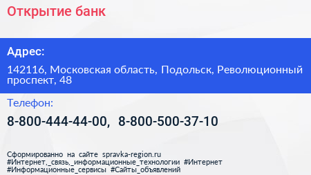 Открытие, банк по адресу 142116, Московская область, Подольск, Революционный проспект, 48 в дальнейшем Организация, размещена в следующих категориях: