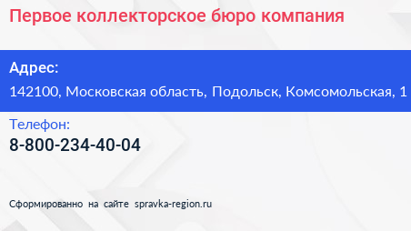 Первое коллекторское бюро, компания по адресу 142100, Московская область, Подольск, Комсомольская, 1 в дальнейшем Организация, размещена в следующих категориях: