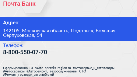 Почта Банк по адресу 142105, Московская область, Подольск, Большая Серпуховская, 54 в дальнейшем Организация, размещена в следующих категориях: