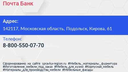 Почта Банк по адресу 142117, Московская область, Подольск, Кирова, 61 в дальнейшем Организация, размещена в следующих категориях: