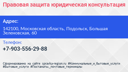 Правовая защита, юридическая консультация по адресу 142100, Московская область, Подольск, Большая Зеленовская, 60 в дальнейшем Организация, размещена в следующих категориях: