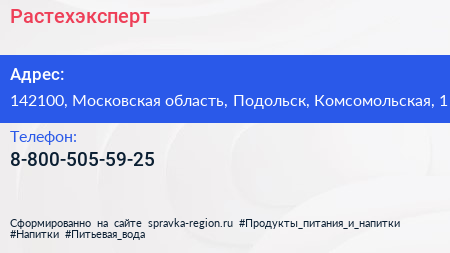 Растехэксперт по адресу 142100, Московская область, Подольск, Комсомольская, 1 в дальнейшем Организация, размещена в следующих категориях: