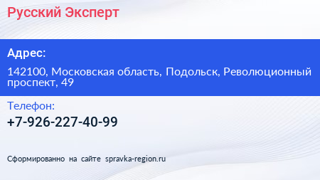 Русский Эксперт по адресу 142100, Московская область, Подольск, Революционный проспект, 49 в дальнейшем Организация, размещена в следующих категориях: