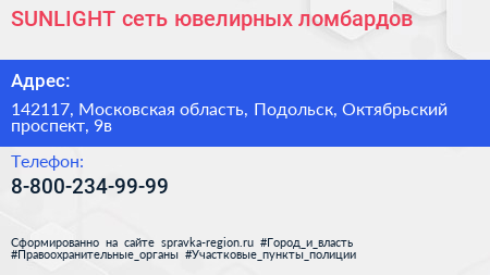 SUNLIGHT, сеть ювелирных ломбардов по адресу 142117, Московская область, Подольск, Октябрьский проспект, 9в в дальнейшем Организация, размещена в следующих категориях: