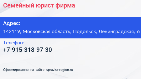 Семейный юрист, фирма по адресу 142119, Московская область, Подольск, Ленинградская, 6 в дальнейшем Организация, размещена в следующих категориях: