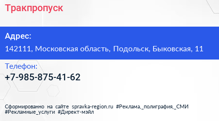 Тракпропуск по адресу 142111, Московская область, Подольск, Быковская, 11 в дальнейшем Организация, размещена в следующих категориях: