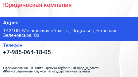 Для связи с организацией воспользуйтесь номером телефона: +7-985-064-18-05.