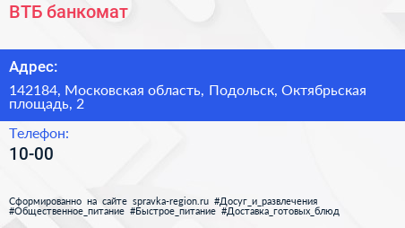 ВТБ, банкомат по адресу 142184, Московская область, Подольск, Октябрьская площадь, 2 в дальнейшем Организация, размещена в следующих категориях: