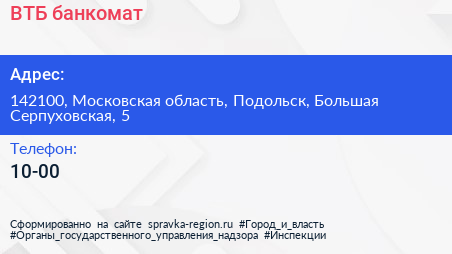 ВТБ, банкомат по адресу 142100, Московская область, Подольск, Большая Серпуховская, 5 в дальнейшем Организация, размещена в следующих категориях: