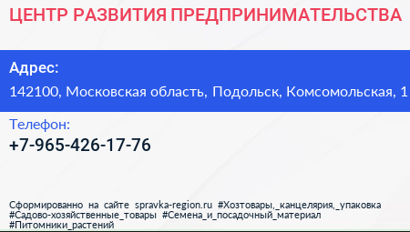 ЦЕНТР РАЗВИТИЯ ПРЕДПРИНИМАТЕЛЬСТВА по адресу 142100, Московская область, Подольск, Комсомольская, 1 в дальнейшем Организация, размещена в следующих категориях: