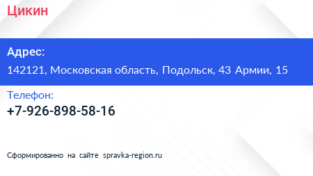 Цикин по адресу 142121, Московская область, Подольск, 43 Армии, 15 в дальнейшем Организация, размещена в следующих категориях: