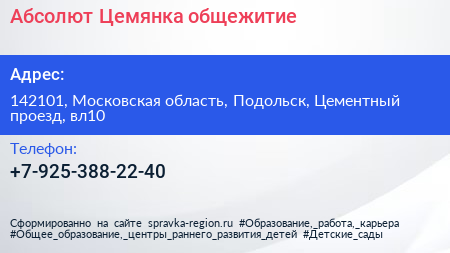 Абсолют Цемянка, общежитие по адресу 142101, Московская область, Подольск, Цементный проезд, вл10 в дальнейшем Организация, размещена в следующих категориях: