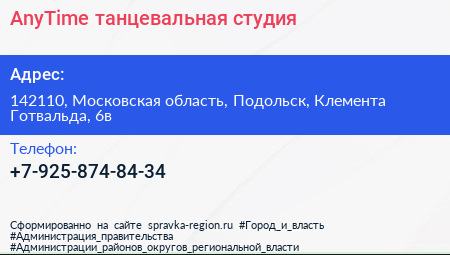 AnyTime, танцевальная студия по адресу 142110, Московская область, Подольск, Клемента Готвальда, 6в в дальнейшем Организация, размещена в следующих категориях: