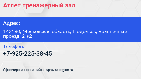 Атлет, тренажерный зал по адресу 142180, Московская область, Подольск, Больничный проезд, 2 к2 в дальнейшем Организация, размещена в следующих категориях:
