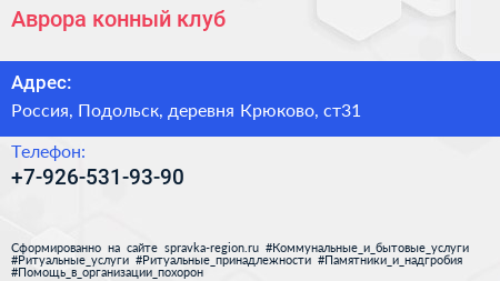Аврора, конный клуб по адресу Парковка КСК "Аврора" частная, Подъездная улица, Чулпаново, Жуково, городской округ Домодедово, Московская область, Центральный федеральный округ, 142181, Россия в дальнейшем Организация, размещена в следующих категориях: