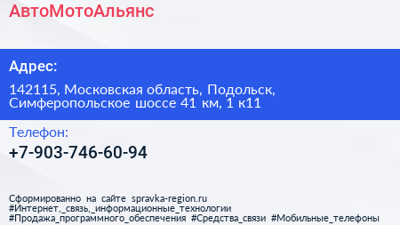 АвтоМотоАльянс по адресу 142115, Московская область, Подольск, Симферопольское шоссе 41 км, 1 к11 в дальнейшем Организация, размещена в следующих категориях: