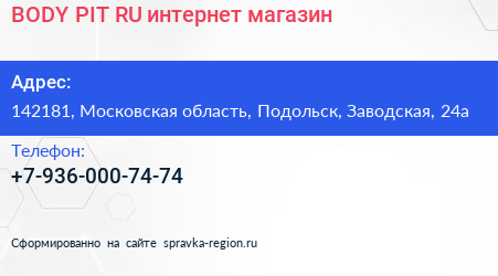 BODY-PIT.RU, интернет-магазин по адресу 142181, Московская область, Подольск, Заводская, 24а в дальнейшем Организация, размещена в следующих категориях: