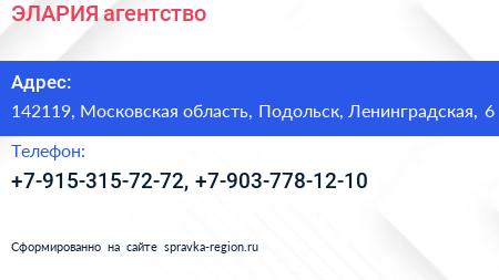 ЭЛАРИЯ, агентство по адресу 142119, Московская область, Подольск, Ленинградская, 6 в дальнейшем Организация, размещена в следующих категориях: