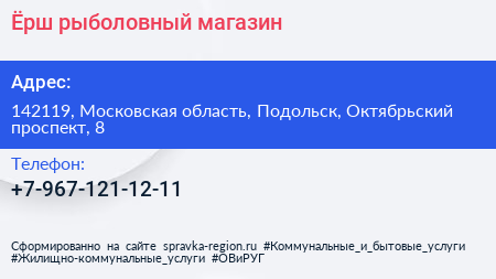 Ёрш, рыболовный магазин по адресу 142119, Московская область, Подольск, Октябрьский проспект, 8 в дальнейшем Организация, размещена в следующих категориях:
