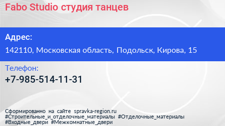 Fabo Studio, студия танцев по адресу 142110, Московская область, Подольск, Кирова, 15 в дальнейшем Организация, размещена в следующих категориях: