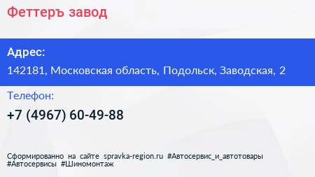 Феттеръ, завод по адресу 142181, Московская область, Подольск, Заводская, 2 в дальнейшем Организация, размещена в следующих категориях: