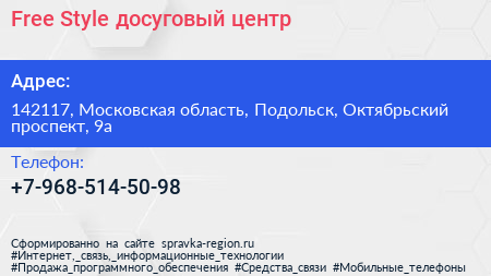Free Style, досуговый центр по адресу 142117, Московская область, Подольск, Октябрьский проспект, 9а в дальнейшем Организация, размещена в следующих категориях:
